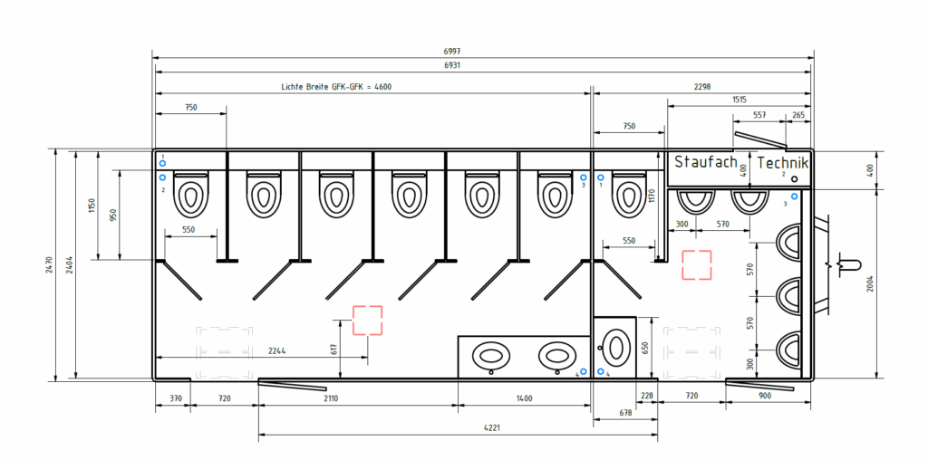 6x Damenkabinen, 1x Herrenkabine, 5x Urinale